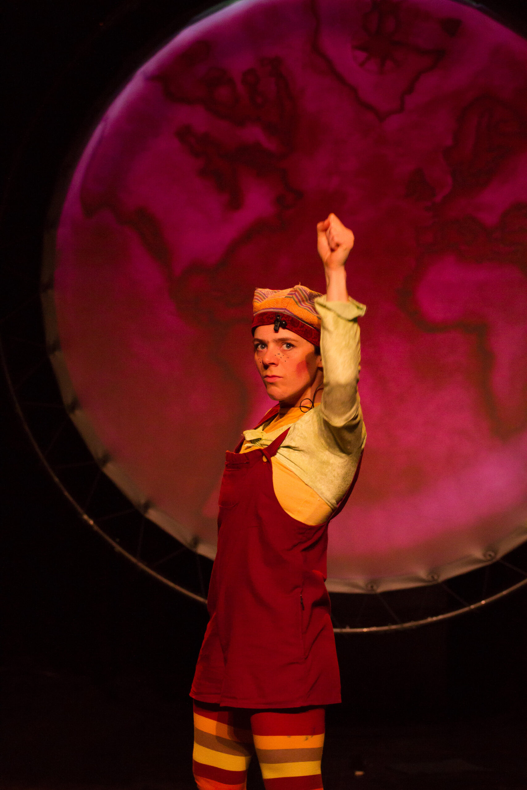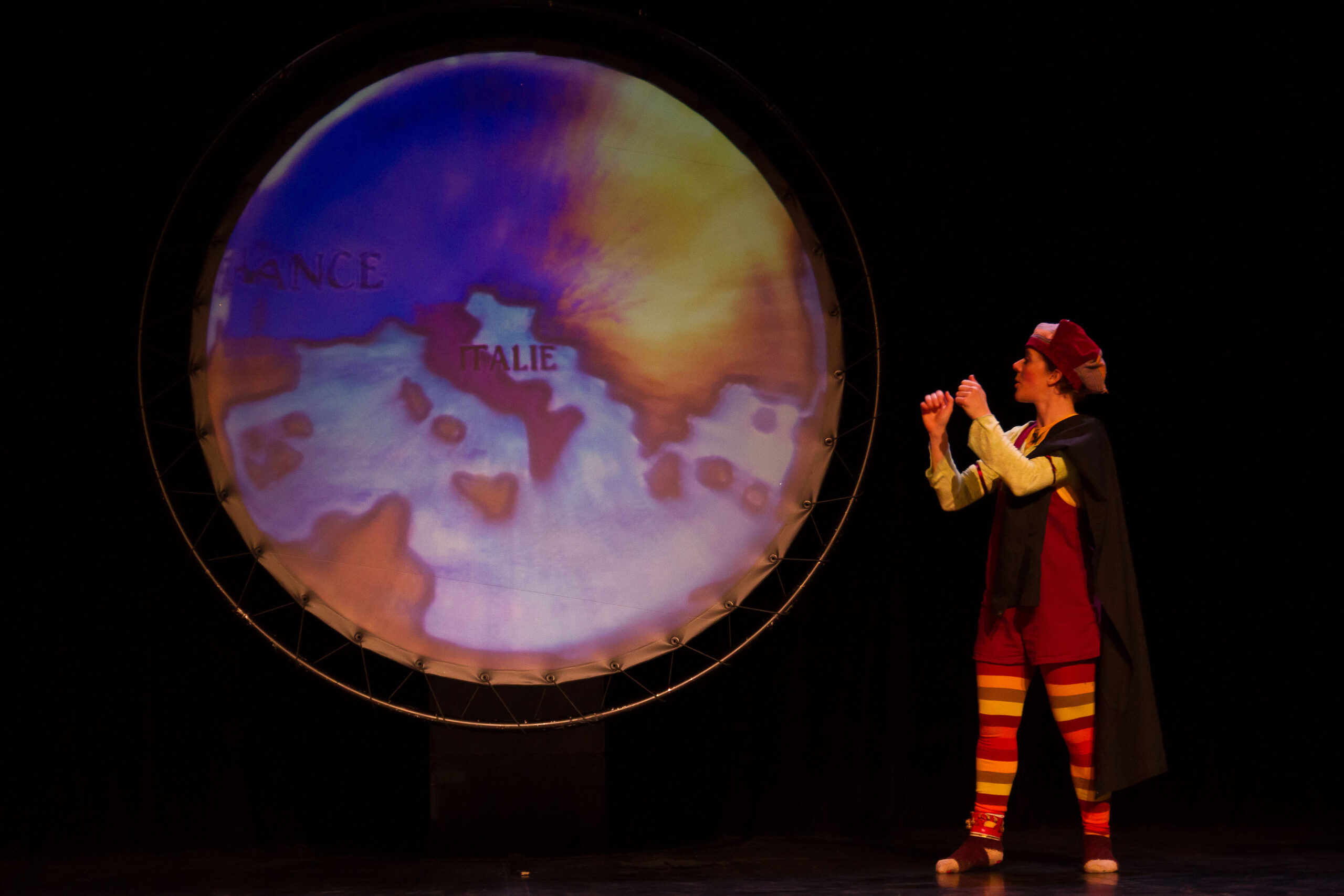L’interprète pluridisciplinaire croque personnages et pays en cartes postales vivantes, passe du rap à l’opéra en un claquement d’orteils. Ainsi, on bondit de surprises en étonnements, d’instruments de musique en binious exotiques, le tout rythmé par les chants, acrobaties et facéties et par une mappemonde interactive. Le rire fuse, prenant sa source à divers endroits selon l’âge car plusieurs degrés de lecture sont possibles. Oubliez un instant les concepts  d’appropriation culturelle et laissez-vous jubiler de voir ce personnage s’empêtrer dans ses découvertes, et se faire dépasser par la musique à un point joyeusement déraisonnable…